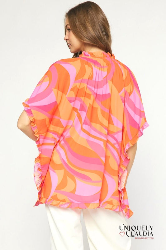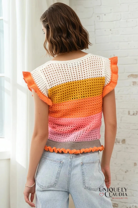 Keesha Crochet Knitted Multi Stripe Ruffle Sleeve Top