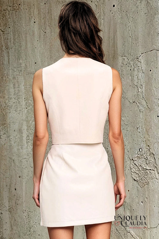 Mia Allure Cream Vegan Leather Vest & Skirt Set