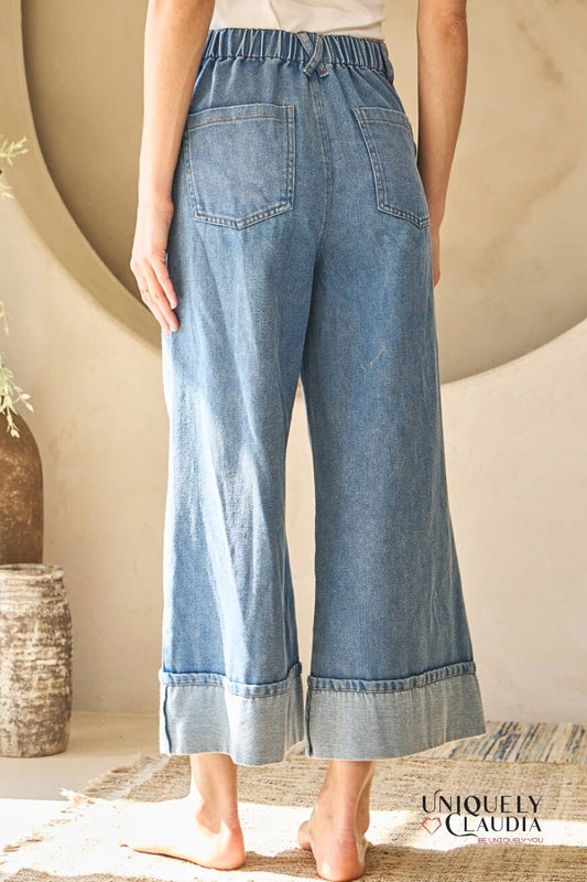 Patsy Bow Embellished Washed Denim Wide Leg Pants