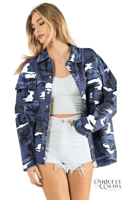EDGY PLUS: Hallie Army Print Slate Blue Shacket