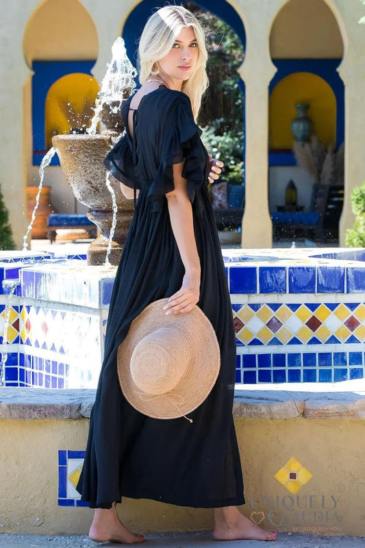 EDGY PLUS: Scarlett Deep V-Neck Ruffle Black Maxi Dress
