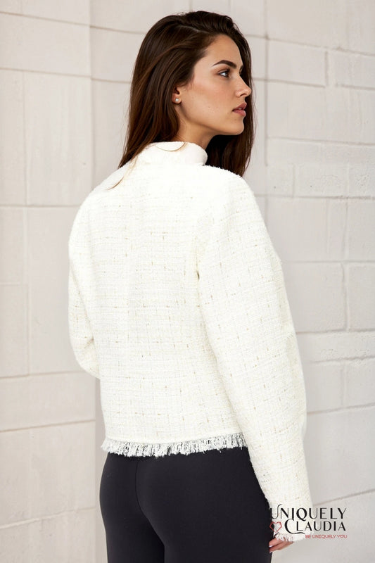 Genevieve Tweed Fringe Cream Cropped Blazer